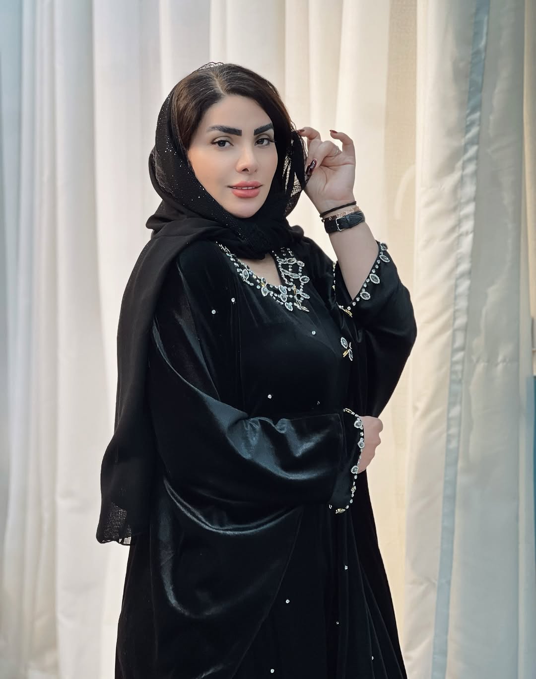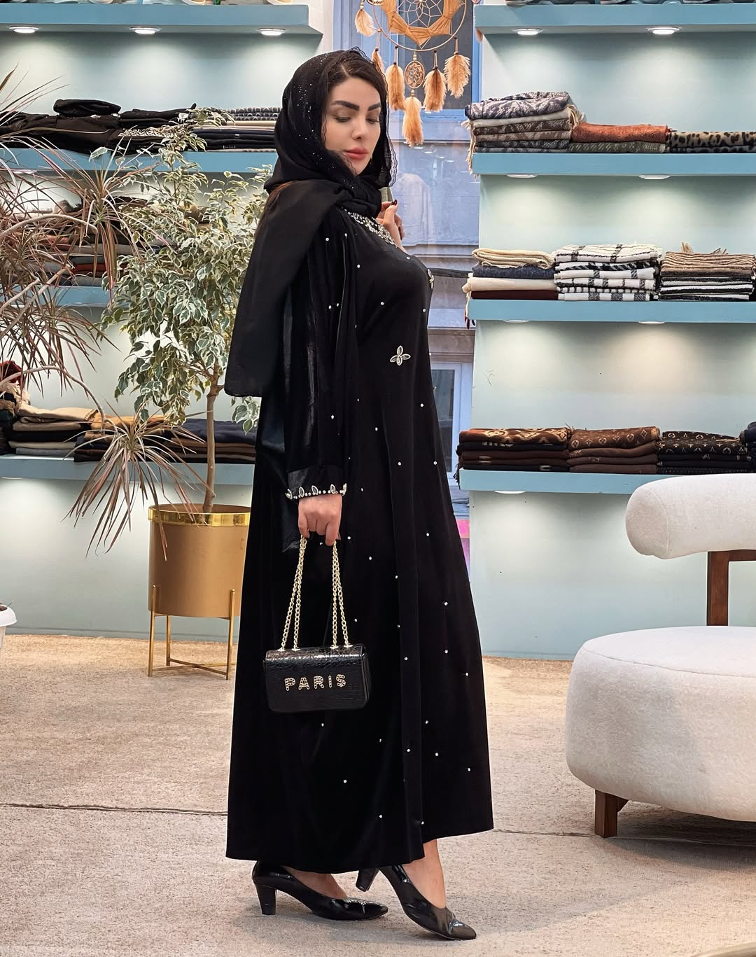 مانتو عبای زیبا از جنس مخمل با سنگ دوزی، مناسب برای سایزهای ۴۰ تا ۵۶.